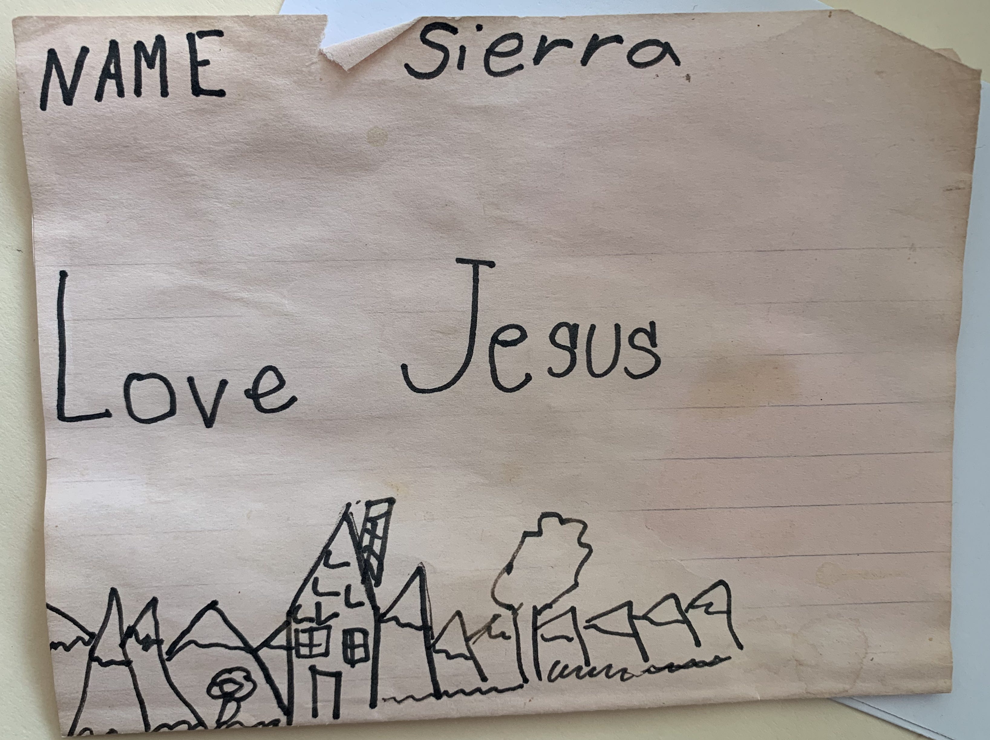 Part of my “call to ministry” was realizing as a very very young child that people didn’t know Jesus loved them, and I was very compelled to help people know this. So much that I wrote out my message many times and delivered these missives door to door in the town where I now live. When I moved back here fourteen years ago, a lady in that same neighborhood dug out this piece of paper for me and showed me my earnest handiwork that I’d done as a tiny child.